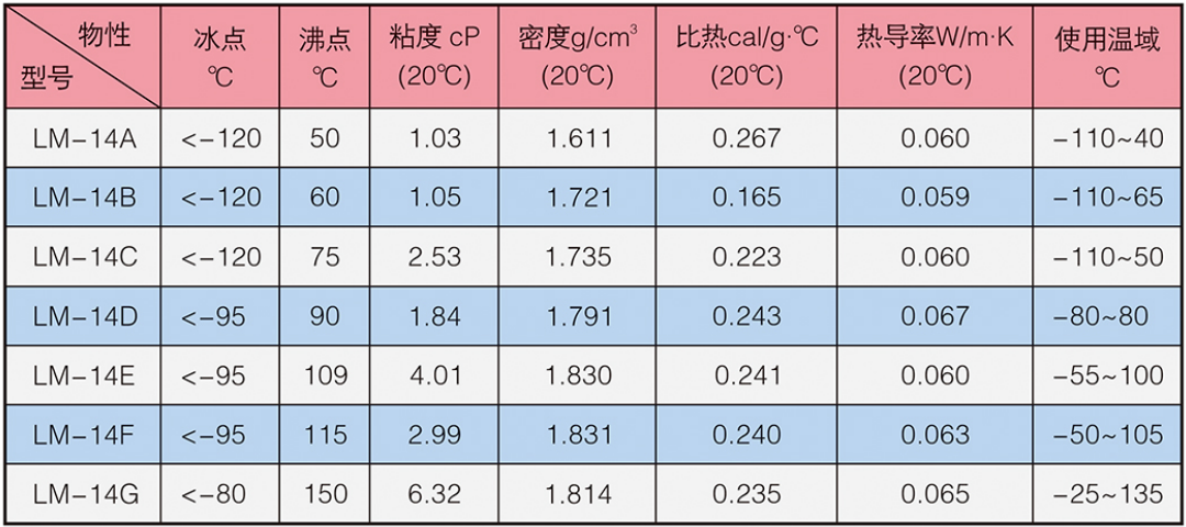 LM-14系列產(chǎn)品由全氟化合物改性而成,無閃點(diǎn)、不可燃,使用安全性好;臭氧消耗潛值為零,全球變暖潛能值極低,環(huán)境友好。本品具有優(yōu)異的電絕緣性能和理想的化學(xué)惰性;同時(shí)還具有優(yōu)良的導(dǎo)熱性能,良好的流動(dòng)性,對(duì)碳鋼、不銹鋼、紫銅等金屬防銹性能優(yōu)良,具有廣泛的適用性。