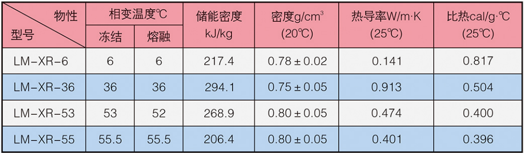 LM-XR系列產(chǎn)品由主儲能劑、相變調(diào)整劑、防過冷劑、防相分離劑、誘發(fā)劑等多組分復(fù)合制備而成。本品通過固-液-固相態(tài)變化實現(xiàn)熱能的儲存和釋放,具有較高的儲能密度及合適的比熱和導(dǎo)熱系數(shù)。本品不易揮發(fā)、安全可靠,可以反復(fù)使用。